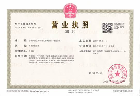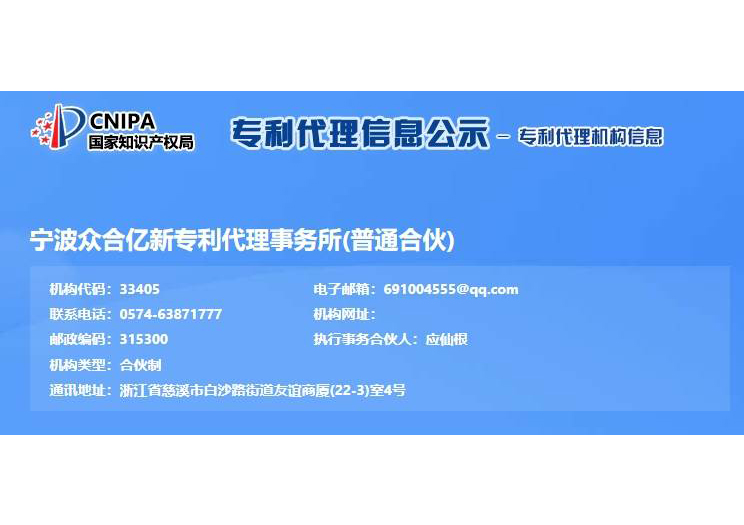 浙江億新知識產(chǎn)權(quán)服務(wù)有限公司前身為慈溪眾合知識產(chǎn)權(quán)代理事務(wù)所,創(chuàng)始于2004年,為了服務(wù)更多的創(chuàng)新企業(yè),實現(xiàn)“服務(wù)億萬創(chuàng)新企業(yè)”的理念,后更名為浙江億新知識產(chǎn)權(quán),旗下公司包括:寧波眾合億新專利代理事務(wù)所(機構(gòu)代碼33405)、中范(北京)認(rèn)證有限公司。其中寧波眾合億新專利代理事務(wù)所是慈溪市科技服務(wù)聯(lián)盟理事單位,前灣區(qū)知識產(chǎn)權(quán)工作站。公司位于浙江省慈溪市文化商務(wù)區(qū)友誼商廈,并在北京、青島設(shè)有辦事處。